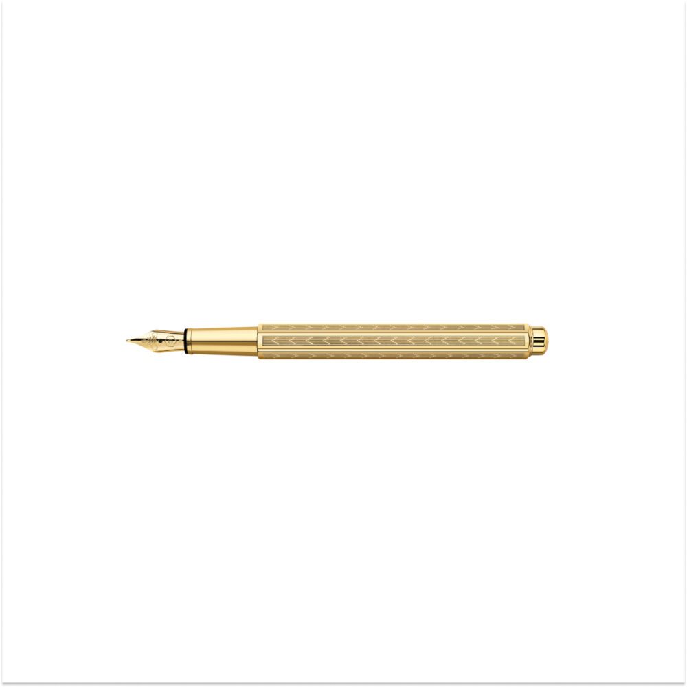 This Caran d’Ache Chevron Gilt Gold Plated Fountain Pen is beautifully designed with it’s intricate inverted V engraved detailing on the body of the pen and pen cap. The gold plating gives this pen a rich,luxurious look. This Pen comes with a Medium Nib which is the most popular size of nib for fountain pens, as they are good for those with average-size handwriting and provide around a 0.8mm line width. This fountain pen comes with a piston pump and can be refilled with any of the small Caran d’Ache chromatic ink cartridges. This Caran d’Ache Pen comes with a high quality protective case to keep your fountain pen safe.
